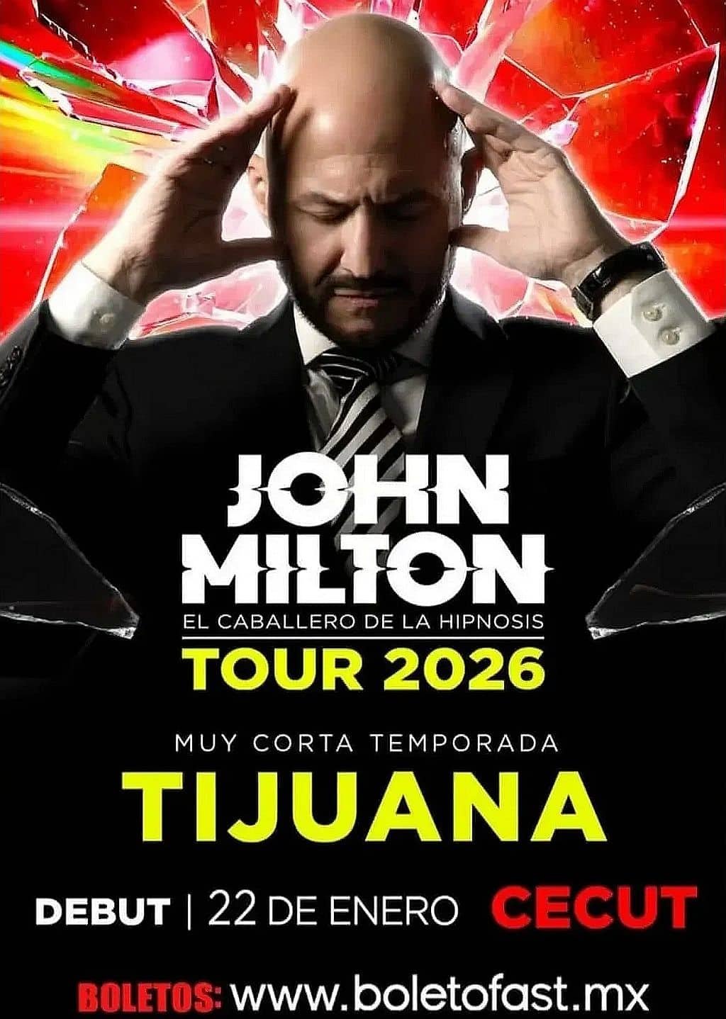 John Milton en Tijuana regresa en 2026 con su aclamado espectáculo El Caballero de la Hipnosis, presentándose del 22 de enero al 8 de febrero de 2026 en el Centro Cultural Tijuana (CECUT). Esta temporada especial forma parte de su Tour 2026 y posiciona a Tijuana como una de las sedes más importantes de su gira nacional.