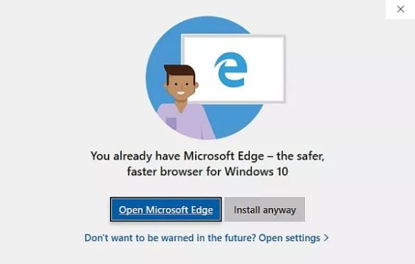 Tal y si pareciese un malware, el más reciente build beta de la futura actualización del sistema intercepta e interrumpe la instalación del programa de navegación de internet, y en su lugar muestra un mensaje en pantalla completa en donde se anuncia al usuario que ya dispone de Microsoft Edge, “el navegador más seguro y rápido” de Windows 10 y le ofrece tres opciones: abrir Edge, continuar con la instalación o desactivar por completo este tipo de avisos.